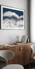 Et roligt vinterlandskab udfolder sig i klare, blålige toner: majestætiske, sneklædte tinder rejser sig over tågedale, mens bløde skyer driver hen over himlen. Den rene, kølige atmosfære indbyder til fordybelse og ro. Et poetisk blik på bjergenes styrke og stilhed, skabt af Xiaoyang Wang. Perfekt som roligt fokuspunkt i stuen.