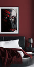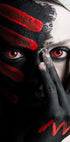 Dette intense portræt viser en kvinde med markante røde øjne og dramatisk kropsmaling i ildfulde nuancer. Sorte og røde strøg over ansigt og hænder fremkalder ildens rå kraft og forener figurativ fotografi med symbolsk kunst. Et dristigt og fængslende kunstværk, der udstråler passion, styrke og intensitet.