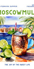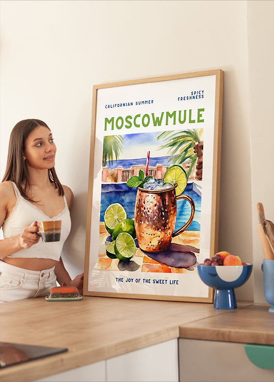 Denne livlige plakat viser en forfriskende Moscow Mule serveret i et kobberkrus, ledsaget af friske limefrugter og en pool i baggrunden. Med stærke farver og sommerlig stemning indfanger den glæden ved citrus, friskhed og afslapning — et perfekt kunstværk til køkkener, barer eller sommerinspirerede billedvægge.