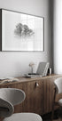 Et stille, monokromt vinterlandskab svæver i dis og sne. Tre nøgne træer står som fine streger i det hvide, mens tågen udvisker horisonten og skaber ro og eftertanke. Minimalistisk og grafisk i sit udtryk, fanger værket af Oliver Buchmann vinterens poetiske stilhed og inviterer til fordybelse. Perfekt til rolige rum.