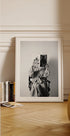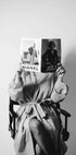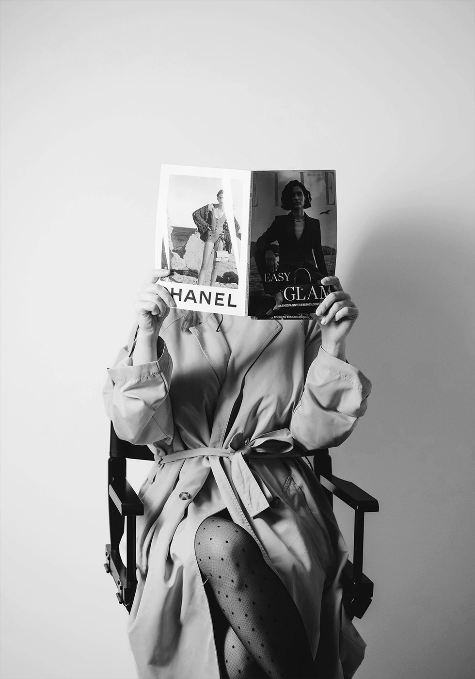 Et sofistikeret sort-hvidt fotografi af en kvinde i trenchcoat og prikkede strømpebukser, der holder op modemagasiner med Chanel og Elle. Kunstværket udstråler tidløs stil og parisisk elegance, perfekt som et statement i moderne, modebevidste interiører.