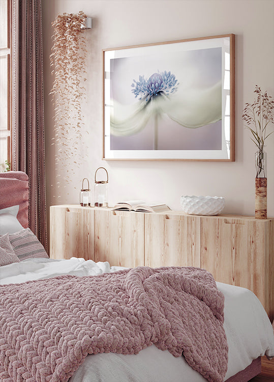 Dette drømmende makrofotografi fanger den skrøbelige elegance i en japansk anemone i bløde nuancer af hvid og lavendel. Med sine æteriske kronblade og detaljerede støvdragere udstråler kunstværket ro og renhed, og skaber et raffineret botanisk værk, der forener stilhed med tidløs blomsterskønhed.