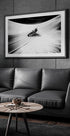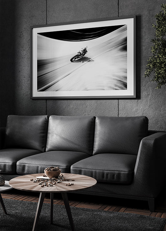 Dette energiske sort-hvide kunstværk fanger en motorcykel i fuld fart, med dramatisk bevægelsessløring, der fremhæver hastighed og kraft. Den skarpe kontrast mellem køreren og de svungne kurver skaber en intens følelse af adrenalin, et markant værk for elskere af fart, motorsport og dristigt design.