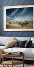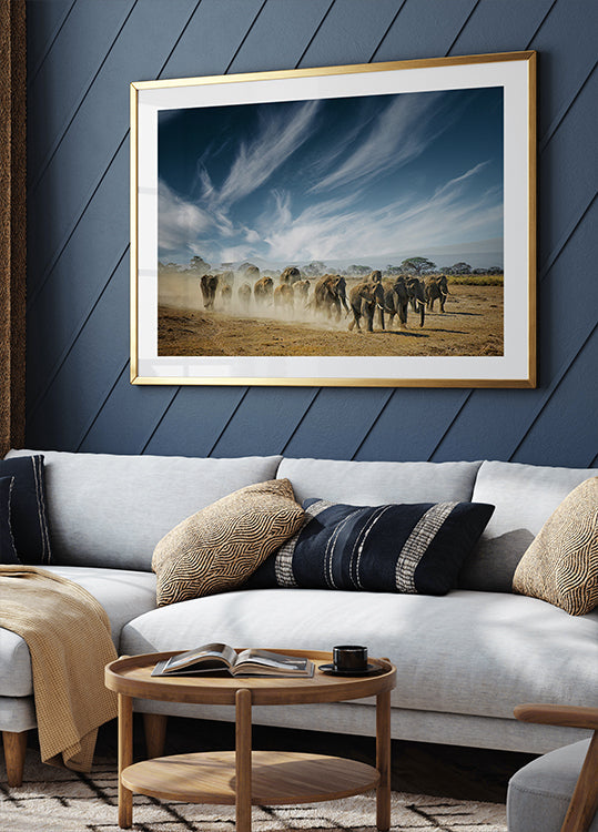 Dette kraftfulde vildtfotografi fanger en majestætisk elefantflok, der stormer hen over den støvede savanne under svungne himle. Scenen udstråler rå styrke, enhed og Afrikas vilde ånd, og bliver et storslået kunstværk, der fejrer natur, frihed og vildmarkens pragt.