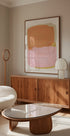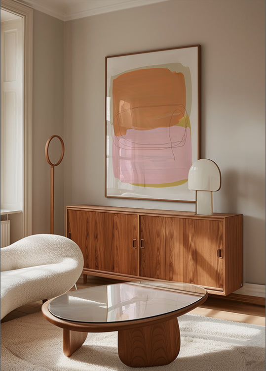 En blød og moderne abstrakt plakat med maleriske penselstrøg i fersken, rosa og subtile gyldne nuancer. De overlappende teksturer og blide linjer skaber en harmonisk balance af varme og ro—perfekt til minimalistiske interiører, skandinavisk indretning eller moderne gallerivægge.