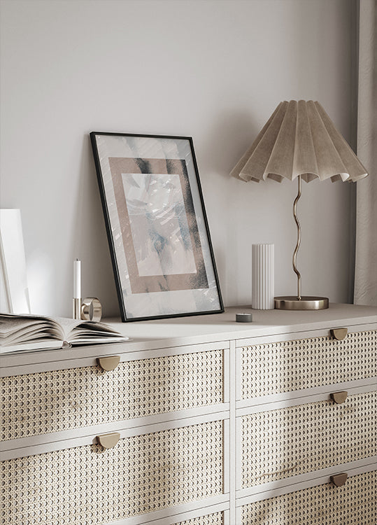 En blød abstrakt plakat med lagdelte penselstrøg i pastel beige, gråt og hvidt, indrammet i subtile geometriske firkanter. De luftige teksturer og den dæmpede palet skaber en afbalanceret komposition, der føles både moderne og rolig—perfekt til skandinaviske interiører, minimalistisk dekoration eller beroligende gallerivægge.
