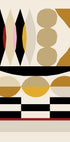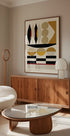 En markant Bauhaus-inspireret abstrakt plakat med geometriske former i jordfarver som okker, beige og sort, suppleret med røde og lyserøde accenter. De rene, strukturerede former skaber en slående visuel balance, der forener moderne minimalisme med mid-century design—perfekt til moderne interiører eller retroinspirerede gallerivægge.