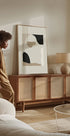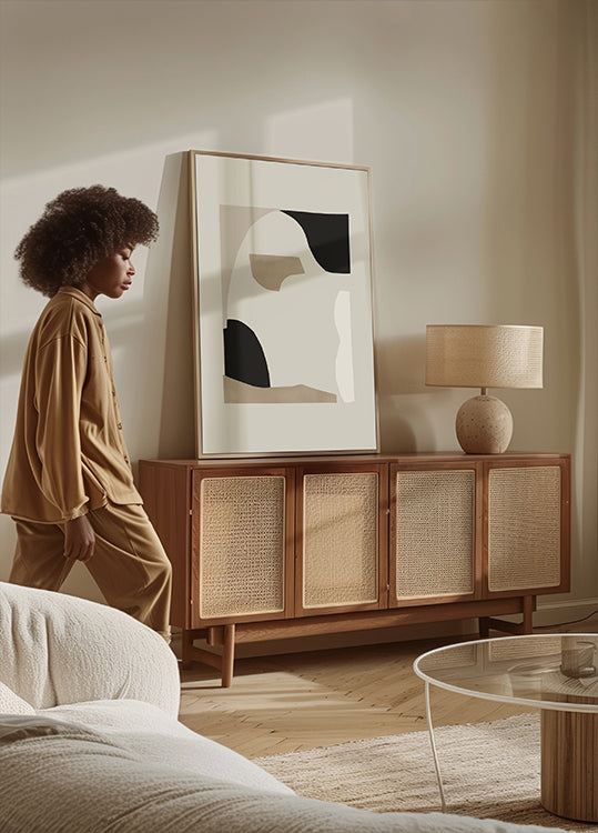 En moderne abstrakt plakat med lagdelte geometriske former i bløde beige, sorte og hvide nuancer. Den minimalistiske komposition skaber balance og kontrast, og kombinerer skandinavisk ro med moderne design. Perfekt til at tilføje sofistikation og harmoni til moderne interiører.