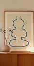 En minimalistisk abstrakt plakat med silhuetten af en vase tegnet i en kraftig blå streg mod en blød beige baggrund. Med enkel geometri og rene linjer indfanger dette kunstværk skandinavisk elegance og moderne indretningstrends, perfekt til et roligt og moderne hjem.