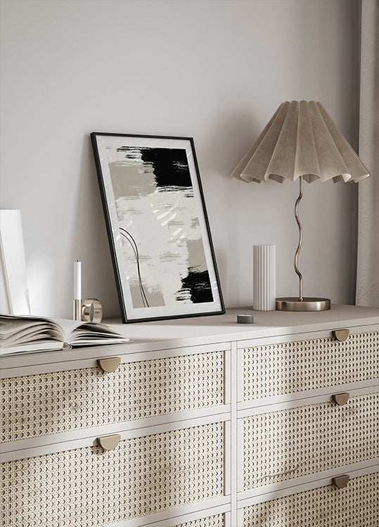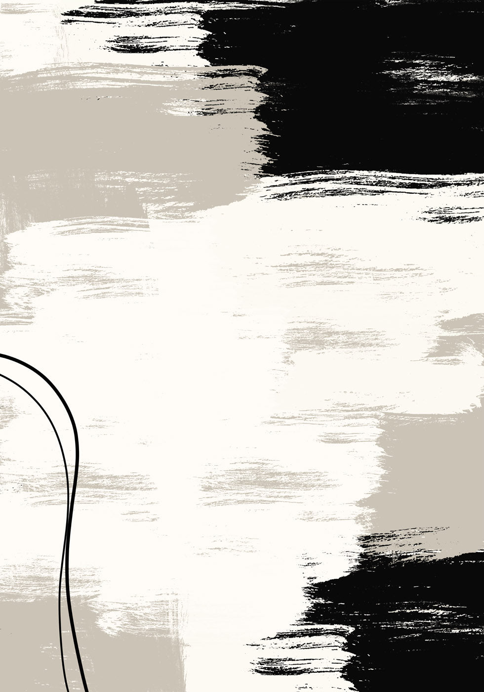 Et moderne abstrakt maleri med dristige penselstrøg i sort, hvid og beige. Den teksturerede komposition bringer en følelse af balance og kunstnerisk udtryk til ethvert interiør. Perfekt til minimalister og kunstelskere.