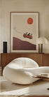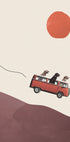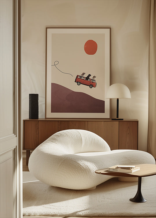 En legende og humoristisk plakat med hunde, der kører i en rød VW-bus over bølgende bakker under en stærk sol. Med sin skæve collage-stil, retrostemning og sjove udtryk fanger kunstværket ånden af frihed, eventyr og venskab.