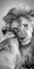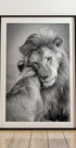En rørende sort-hvid dyrelivsplakat, der viser en løve og en løvinde i en øm omfavnelse. Fanget i Tanzanias Serengeti symboliserer dette kunstværk kærlighed, styrke og hengivenhed i naturen. Perfekt til natur-, dyre- og romantiske indretninger.