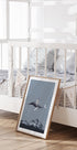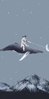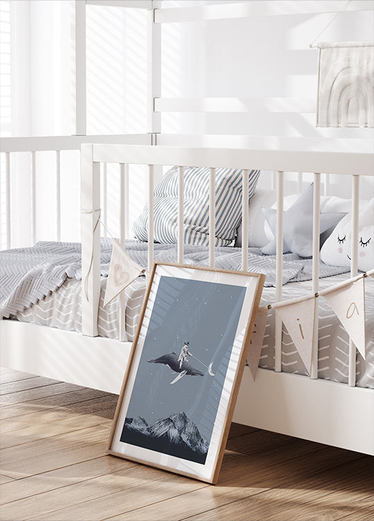 Et surrealistisk og fantasifuldt kunstværk, der viser en dreng, som rider på en hval gennem en stjerneklar nattehimmel, mens han styrer halvmånen med en pind. Over snedækkede bjerge fanger denne drømmende komposition barndommens undren, fantasi og grænseløse forestillingsevne – perfekt til børneværelser og legende interiører.
