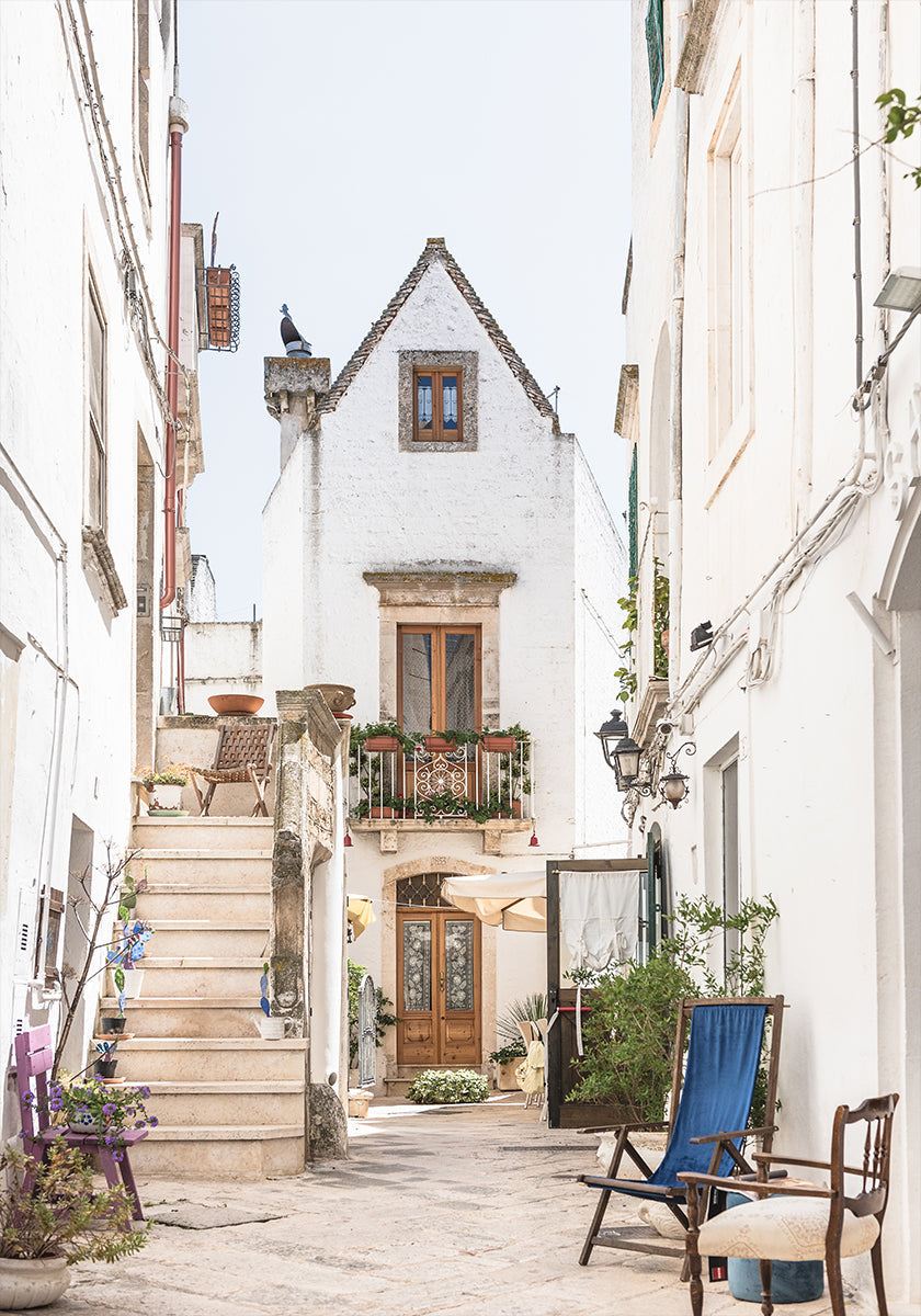 Træd ind i en solfyldt gyde i Locorotondo, hvor hvidkalkede huse, smedejernsbalkoner og terrakottakrukker med grønne planter skaber en poetisk ro. Smalle trapper og åbne døre leder blikket gennem den italienske landsby, mens lyset danser på stenene og inviterer til langsom vandren og mediterran dagdrøm.