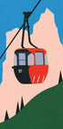 En dristig og legende grafisk illustration af en rød svævebane, der glider gennem alperne. Med rene linjer, flade farver og en retro rejseæstetik indfanger værket glæden ved bjerg-eventyr og den tidløse charme ved højfjeldstransport i en moderne, kunstnerisk stil.