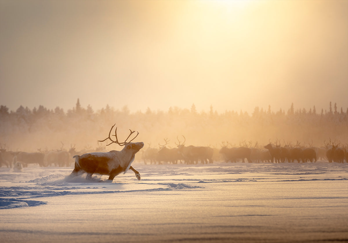 En majestætisk alfa-rensdyr står forrest i et sneklædt landskab, geviret tegnet skarpt mod den kolde luft, mens en stille flok anes i baggrunden. Gyldent vinterlys bryder gennem frosten og skaber et poetisk møde mellem styrke og ro. Et stemningsfuldt motiv af Patrik Minar. Perfekt til at bringe nordlig ro og eventyr ind i hjemmet.