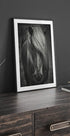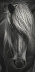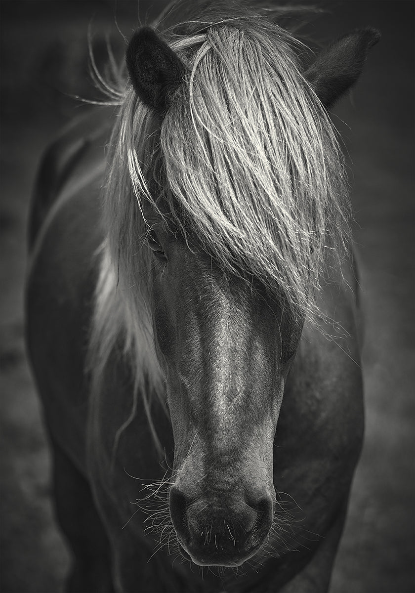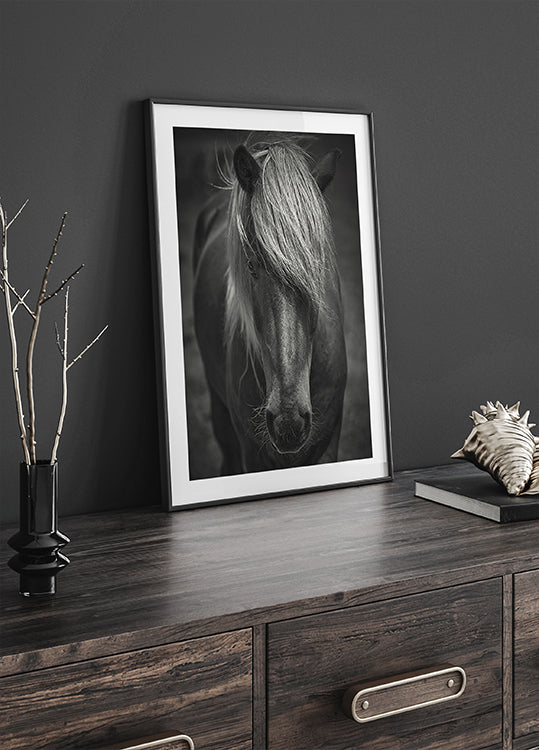 Et markant sort-hvidt portræt af en islandsk hest, med manken faldende fremad i et stilfuldt, vindblæst look. De monokrome toner fremhæver hårets rå tekstur og dyrets rolige styrke, hvilket skaber et dristigt men intimt dyreportæt. Perfekt til naturelskere og minimalistiske interiører.