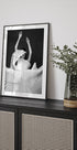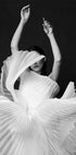 Et markant sort-hvidt portræt af en kvinde i en skulpturel plisseret kjole, fanget midt i bevægelse. De dramatiske folder og det flydende stof skaber en følelse af rytme og elegance, der minder både om dans og abstrakt skulptur. Et dristigt monokromt kunstværk, der blander mode, bevægelse og kunst.