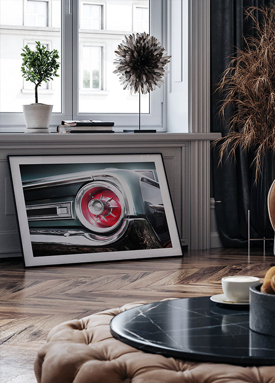 Et detaljeret close-up af baglygten på den legendariske 1964 Ford Galaxie 500, et ikon inden for amerikansk bildesign. Kunstværket fremhæver kromdetaljerne, de elegante linjer og den karakteristiske røde baglygte, som definerede 1960’ernes vejcruisere. Et perfekt nostalgisk stykke for elskere af klassiske amerikanske biler.