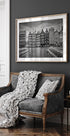 En ikonisk sort-hvid skildring af Amsterdams Damrak: de berømte dancing houses står i grafisk rytme langs kanalen, med spejlinger i det rolige vand og dramatiske skyer over byen. Melanie Viola fanger den historiske facade og urbane puls i et tidløst motiv, perfekt til moderne, nordisk indretning i hjemmet.