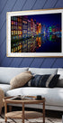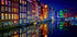 Et strålende nattebillede af Amsterdams ikoniske kanalhuse, hvor farverige facader gløder i lyset og spejler sig perfekt i det stille vand. Dette livlige bylandskab hylder hollandsk arkitektur, urban charme og de magiske reflektioner, der gør Amsterdam uforglemmelig efter mørkets frembrud.