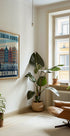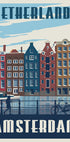 Fang stemningen fra Amsterdam med en stilren rejseplakat: farverige kanalhuse med klassiske gavle spejler sig i vandet, en cykel hviler på broens rækværk, og små både glider forbi under en blød aftenhimmel. Grafisk, minimalistisk og ikonisk – et blikfang, der bringer storbyens charme hjem. Titlen AMSTERDAM står tydeligt som grafisk tekst.