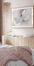 Et delikat nærbillede af en hvid anemoneblomst, hvor bløde kronblade folder sig ud med yndefuld bevægelse. Fanget i drømmende pastelfarver af pink og lilla fremhæver dette botaniske kunstværk naturens skrøbelighed og skønhed og tilfører en rolig og elegant stemning til ethvert interiør.