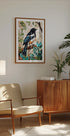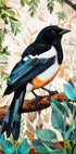 Et fantastisk akvarelinspireret kunstværk af en skade, der sidder på en gren omgivet af livlige blade og planter. Denne detaljerede fugleillustration fanger naturens skønhed med fuglens glinsende fjer og elegante holdning. Perfekt til dyrelivsentusiaster, botanikunstfans eller som dekoration i stuen, soveværelset og på gallerivægge.