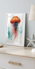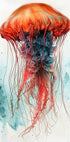 En fantastisk akvarelillustration af en vandmand, med ildorange klokke og lange tråde, der svæver yndefuldt i blå nuancer. Dette marine kunstværk indfanger undervandslivets elegance med maleriske detaljer og forener kunst og natur i en betagende akvatisk scene.