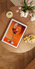 Et livligt orange kunsttryk med et glas Aperol Spritz, isterninger og en frisk appelsinskive. Dette friske og sommerlige kunstværk bringer en smag af sommer ind i hjemmet – perfekt til køkkener, barer og moderne interiører med en livlig atmosfære.