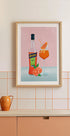 En frisk og livlig illustration af Aperol Spritz, med en flaske, citrusfrugter og et cocktailglas med is og appelsinpynte mod en blød lyserød baggrund. Legende og farverigt, dette kunstværk indfanger essensen af italiensk sommer og aperitivo-kultur, perfekt til køkkener, barer og sociale rum.