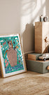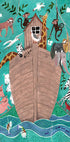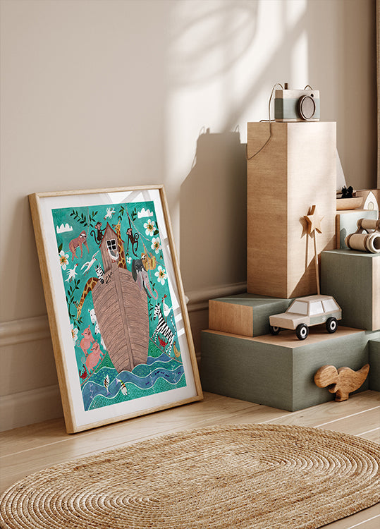 En legende og farverig illustration af Noahs ark fyldt med dyr som giraffer, elefanter, zebraer, aber og fugle. Omgivet af frodige blomster og livligt vand indfanger dette charmerende kunstværk glæden og fantasien i den elskede bibelhistorie. Perfekt til børneværelser, nurseries eller til alle, der elsker dyreillustrationer.