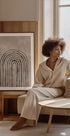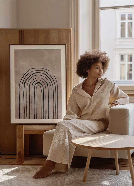 Grafisk og minimalistisk motiv med sorte buer, der rejser sig i rytmiske lag på en varm, beige baggrund. Den klare symmetri og kontrasten mellem lys og mørke skaber ro, dybde og retning. Et tidløst fokuspunkt, der tilfører balance til stue, entré eller hjemmekontor. Passer smukt til nordisk, moderne og japandi-inspirerede rum.