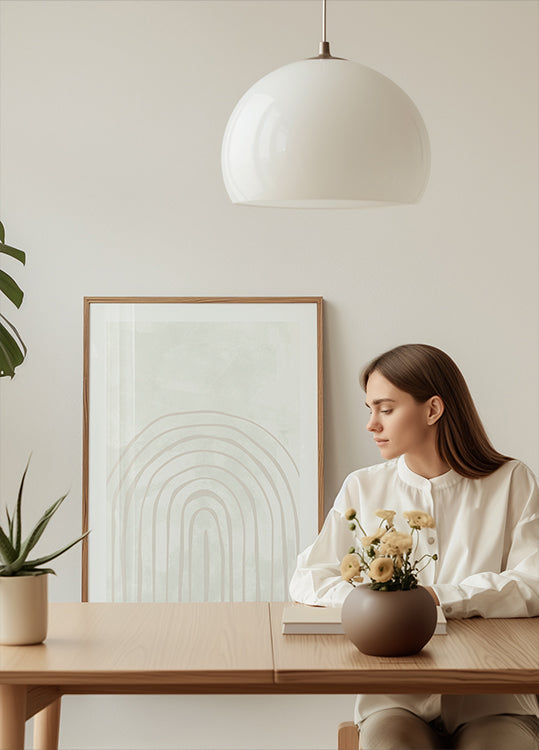 En rolig, minimalistisk komposition af buer og lineær geometri i varme beige- og sandtoner. Lagdelte former og bløde skygger skaber dybde og bevægelse, mens den symmetriske rytme giver et tidløst, arkitektonisk udtryk. Perfekt som elegant fokuspunkt i stue, gang eller soveværelse og klæder nordisk indretning med sin afdæmpede palet.
