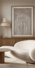 En minimalistisk abstrakt plakat med håndtegnede buelinjer i skarp hvid på en blød beige tekstureret baggrund. Den organiske geometri og neutrale farvetoner giver en beroligende balance, ideel til Japandi, skandinaviske eller moderne minimalistiske interiører.