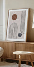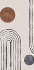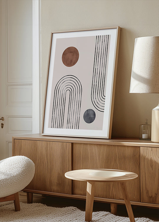 En elegant abstrakt plakat med stærke geometriske former, cirkler og buede sorte linjer på en beige baggrund. Inspireret af mid-century modern design kombinerer dette minimalistiske kunstværk balance, rytme og elegance, hvilket gør det til et alsidigt stykke til moderne interiører.