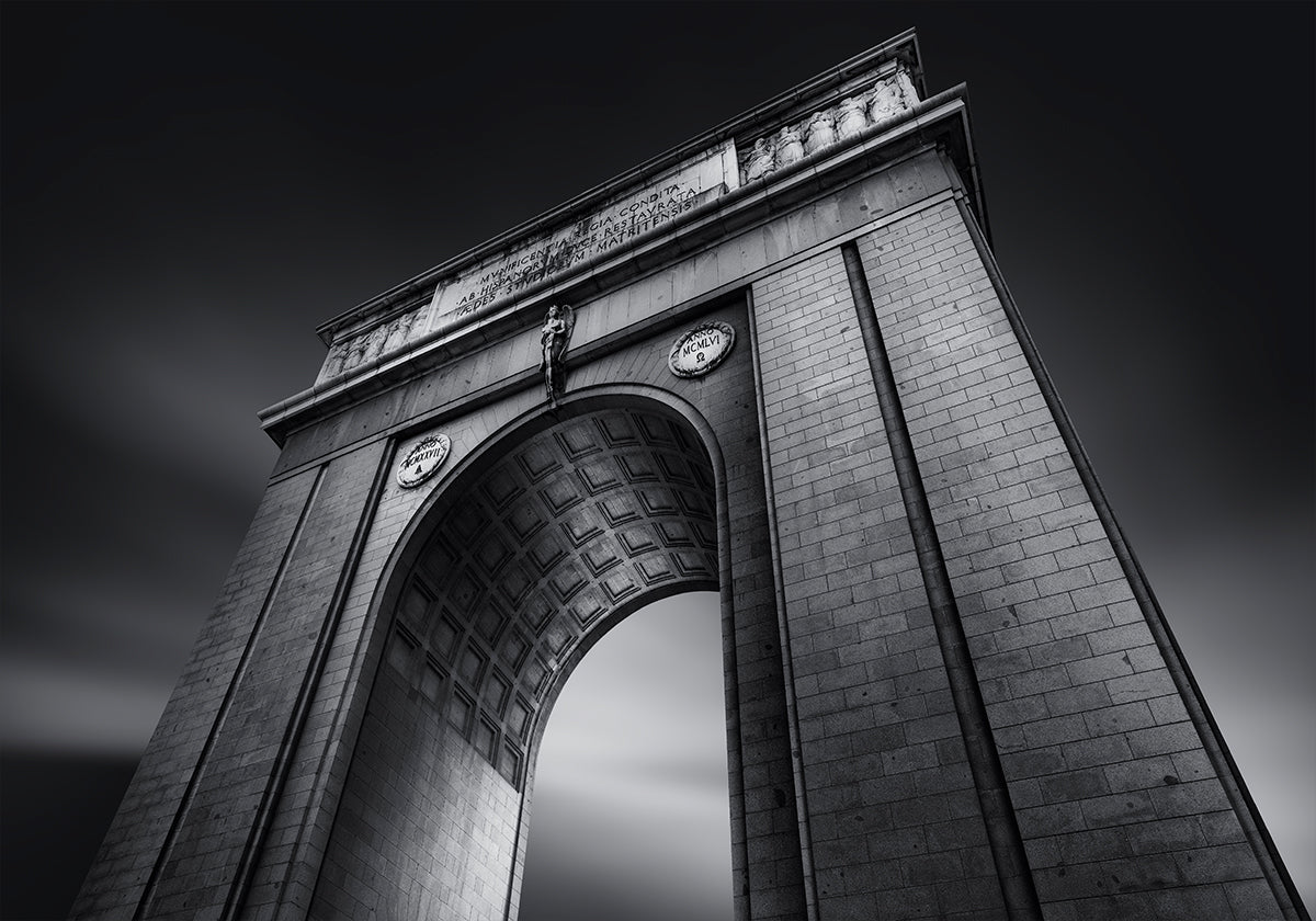 Photographer Jorge Ruiz Dueso frames a monumental triumphal arch in striking black and white, using a bold low-angle perspective to magnify its power. Fine stone details, crisp contrasts, and leading lines pull you through the portal, summoning Madrid’s historic rhythm and the romance of Europe. A refined ode to urban heritage.