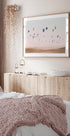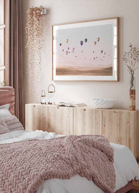 Et drømmende fotografi af farverige luftballoner, der svæver over gyldne sandklitter under en pastelfarvet himmel. Kunstværket indfanger magien ved rejser, frihed og eventyr, og gør det til et smukt stykke til enhver indretning inspireret af rejselyst.