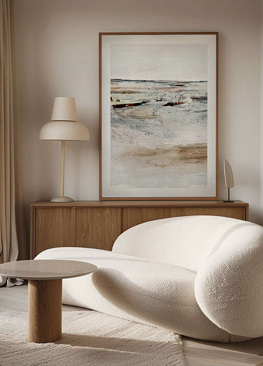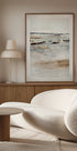 Et roligt abstrakt kystmaleri af Dan Hobday, med lagdelte teksturer og bløde penselstrøg i jordnære toner af beige, hvid og antydninger af rust. Den minimalistiske, maleriske komposition fremkalder følelsen af kysthorisonter og forener moderne abstraktion med naturlig ro. Et perfekt værk til moderne interiører med kyst- eller minimalistisk æstetik.