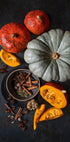 Et rustikt efterårsstilleben med græskar, kanelstænger, muskatnød, kardemomme og stjerneanis. Denne varme og hyggelige komposition indfanger essensen af efterårshøsten og sæsonens smage, perfekt til køkkener og festlig juledekoration.