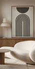 Et minimalistisk abstrakt tryk inspireret af mid-century-stilen med markante sorte buer, der strækker sig op mod en solid sort cirkel. Den geometriske enkelhed i linjer og cirkulær balance gør dette kunstværk til et iøjnefaldende stykke moderne vægdekoration.