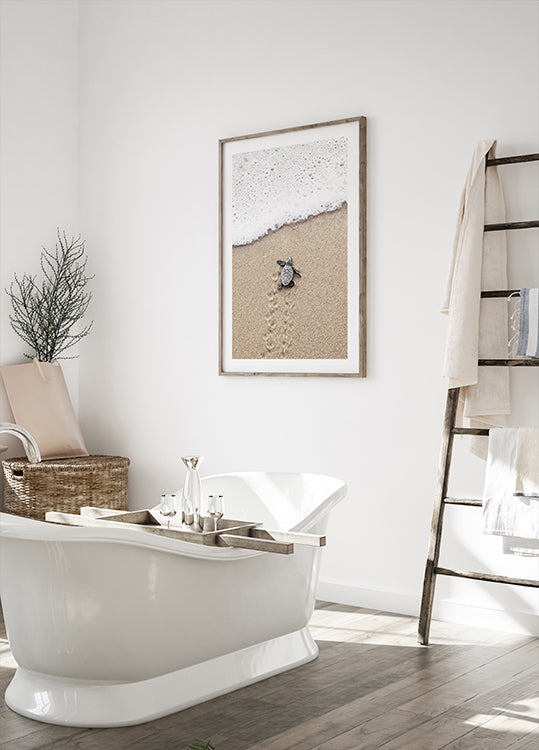 Et inspirerende fotografi, der fanger øjeblikket, hvor en lille skildpadde når havets kant. Små fodspor leder til skildpadden, mens det bløde havskum nærmer sig. Billedet symboliserer starten på en ekstraordinær rejse og er ideel til naturelskere eller dem, der ønsker opmuntrende kunst, der fejrer mod og eventyr.
