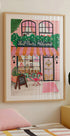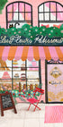 En charmerende illustration af et fransk konditori med lyserøde toner, blomsterdetaljer og en hyggelig caféstemning. Facaden viser farverige kager, bagværk og et indbydende skilt, der indfanger den søde og eventyrlige atmosfære fra et pariserbageri.