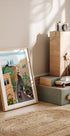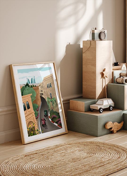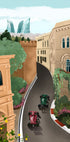 En farverig illustration af Formel 1-biler, der kører gennem Bakus historiske gader i Aserbajdsjan. Kunstværket blander den gamle arkitekturs charme med den moderne skyline, med de ikoniske Flame Towers i baggrunden. Et dynamisk værk, der indfanger fart, kultur og spændingen fra Baku Grand Prix.