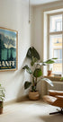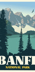 Et tidløst rejsemotiv fra Banff National Park: turkist, spejlblankt bjergvand indrammet af mørkegrønne fyrretræer, med snedækkede tinder der rejser sig i horisonten. Klar vinterluft, stille sne og skarpe refleksioner kalder på eventyr. Elegant typografi fuldender den ikoniske stemning. En ensom fugl svæver over søen.