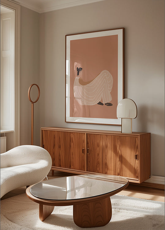 En rolig, tilbagelænet kvindesilhuet basker i eftermiddagens sol, indhyllet i bløde nuancer af fersken, rosa og mokka. Lyset tegner kroppen med elegante skygger og minimalistiske linjer, der skaber en varm, drømmende ro. Basked Sun er et poetisk værk af Casa Cartissi til hjemmets stille stunder. – en solmættet pause.