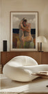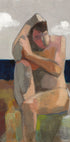 En moderne fortolkning af en siddende bader ved stranden: en kvindelig figur opbygget af geometriske flader og ekspressive penselstrøg. Værket af Tore Bahnson forener kubistiske former med følelsesmættet ro og en tidløs, solmættet atmosfære. Perfekt som blikfang i både moderne hjem, gallerier og kunstneriske miljøer.