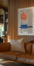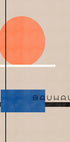 En minimalistisk Bauhaus-inspireret plakat med dristige geometriske former, herunder en stor orange cirkel og en markant blå rektangel på en beige baggrund. Rette linjer og enkle kontraster gør dette kunstværk til et tidløst element i både moderne og vintage interiør.