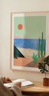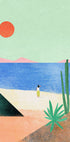 En rolig kystillustration med en enkelt figur, der går langs stranden under en klar sol. De bløde pastelfarver af sand, hav og planter skaber en minimalistisk men livlig sommerstemning—perfekt til at tilføje en afslappet og moderne kystfornemmelse til ethvert rum.