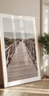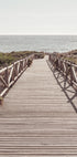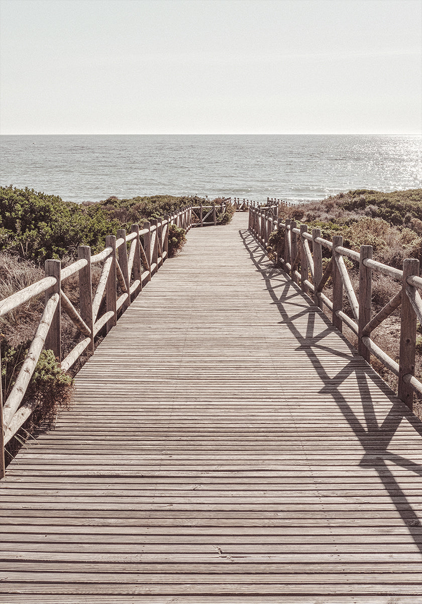 Et fredfyldt kystfotografi, der viser en træpromenade, som fører direkte ned til det glitrende hav. Perspektivet med forsvindingspunkt inviterer beskueren til at gå mod horisonten og vækker følelser af ro, frihed og sommerens stilhed.
